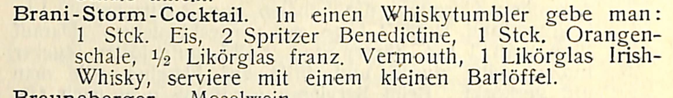 – »In einen Whiskytumbler gebe man: 1 Stck. Eis, 2 Spritzer Benedictine, 1 Stck. Orangenschale, 1/2 Likörglas franz. Vermouth, 1 Likörglas Irish-Whisky, serviere mit einem kleinen Barlöffel.« [2-32]
