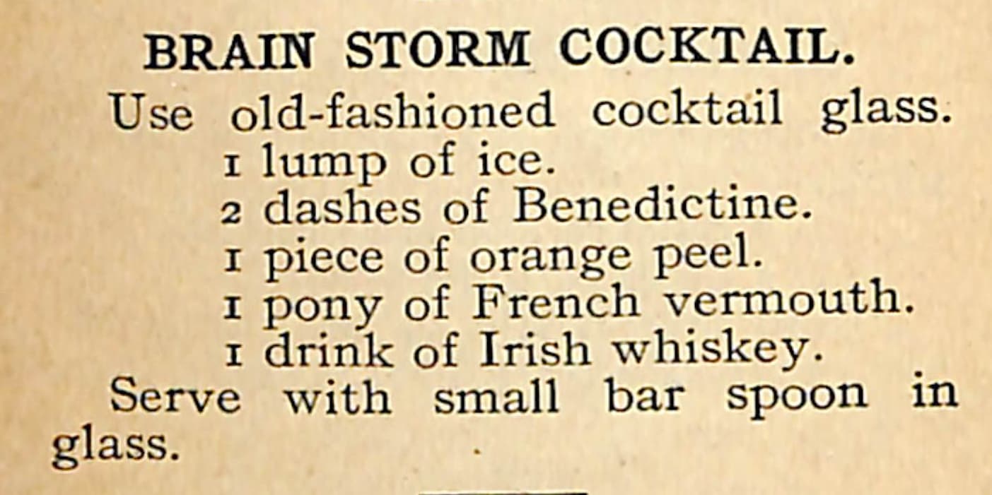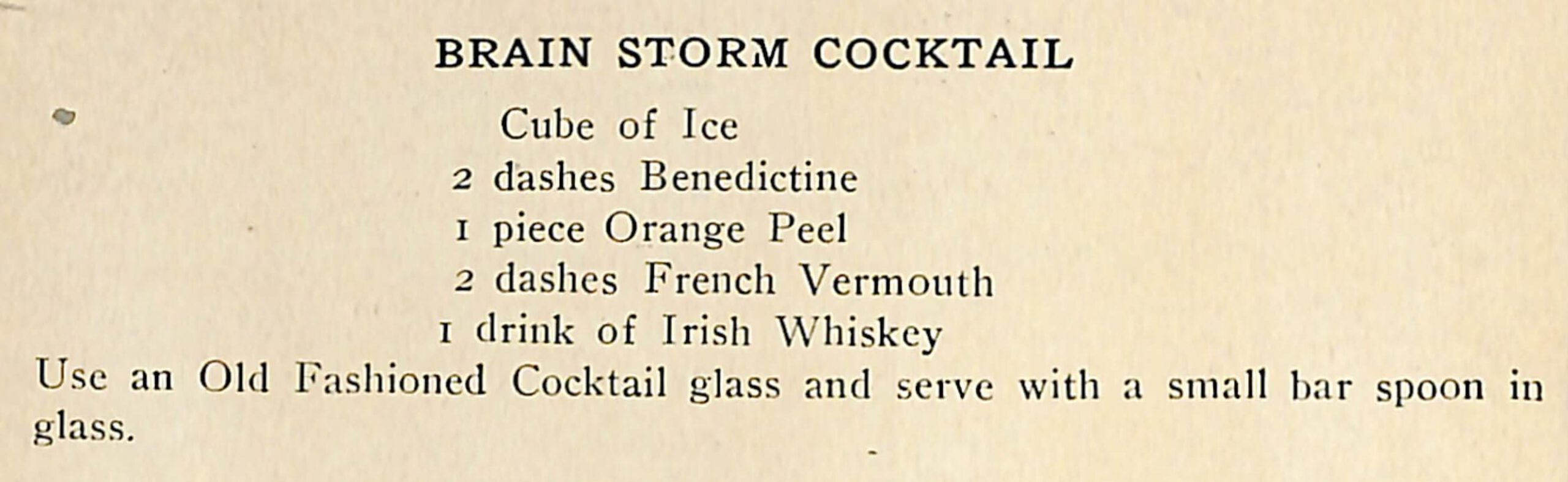 1940 Patrick Gavin Duffy: The official mixer’s manual. Seite 108. Brainstorm Cocktail.