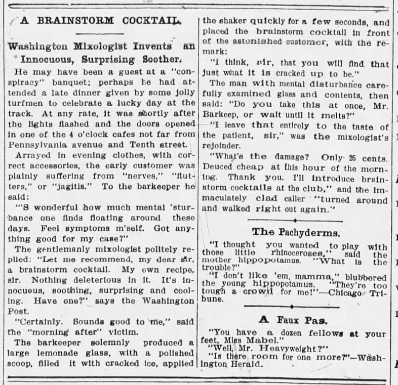 The Brooklyn Daily Times reported on 16 May 1907: “A BRAINSTORM COCKTAIL. Washington Mixologist Invents an Innocous, Surprising Soother. He may have been aguest at a ‘conspiracy’ banquet; perhaps he had atended a late dinner given by some jolly turfmen to celebrate a lucky day at the track. At any rate, it was shortly after the lights flashed and the doors opened in one of the 4 o’clock cafes not far from Pennsylvania avenue and Tenth street. Arrayed in evening clothes, with correct accessories, the early customer was plainly suffering from ‘nerves,’ ‘flutters,’ or ‘jagitis.’ To the barkeeper he said: “‘S wonderful how much mental ‘sturbance one finds floating around these days. Fell symptoms m’self. Got anything good for my case?” The gentlemanly mixologist politely replied: “Let me recommend, my dear sir, a brainstorm cocktail. My own recipe, sir. Nothing deterious in it. It’s innocuous, soothing, surprising and cooling. Have one?” says the Washington Post. “Certainly. Sounds good to me,” said the “morning after” victim. The barkeeper solemnly produced a large lemonade glass, with a polished scoop, filled with cracked ice, applied the shaker quickly for a few seconds, and placed the brainstorm cocktail in front of the astonished customer, with the remark: “I think, sir, that you will find that just what it is cracked up to be.” The man with mental disturbance carefully examined glass and contents, then said: “Do you take this at once, Mr. Barkeep, or wait until it melts?” “I leave that entirely to the taste of the patient, sir,” was the mixologist’s rejoinder. “What’s the damage? Only 25 cents. Deuced cheap at this hour of the morning Thank you. I’ll introduce brainstorm cocktails at the club,” and the immaculately clad caller “turned around and walked right out again.” “ [5]