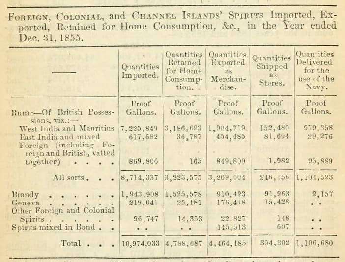Statistics from 1855 on spirits imported into Great Britain illustrate just how important rum was. A total of 7,225,849 proof gallons were imported from the West Indies and Mauritius. Far behind came the East Indies with 617,682 proof gallons and other countries (British or foreign) with 869,806 proof gallons. [8-153]