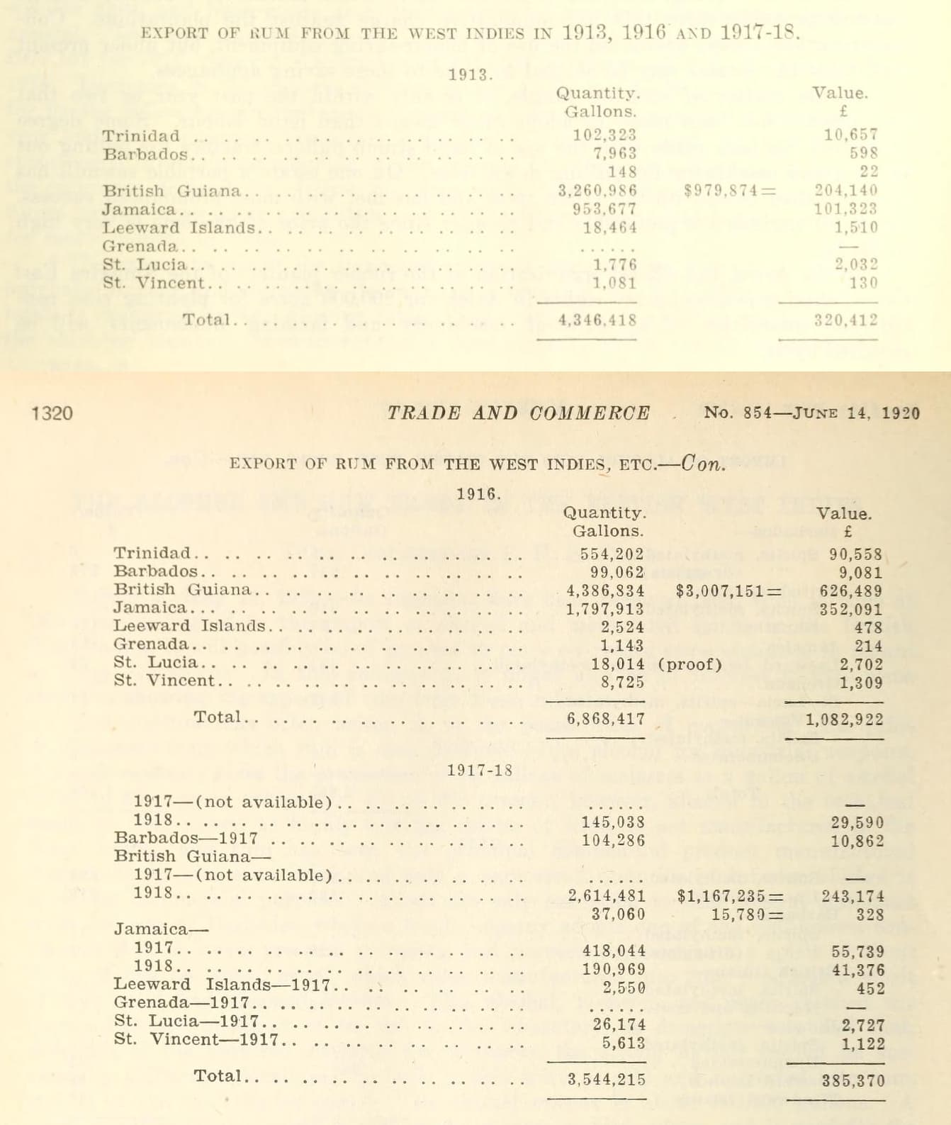 In 1916, the figures were: British Guyana 4.386.834 gal; Jamaica 1.797.913 gal; Trinidad 554.202 gal; Barbados 99.062 gal; St. Lucia 18.014 gal; St. Vincent 8.725 gal. Leeward Islands 2.542 gal; Grenada 1.143 gal; [5-1320]