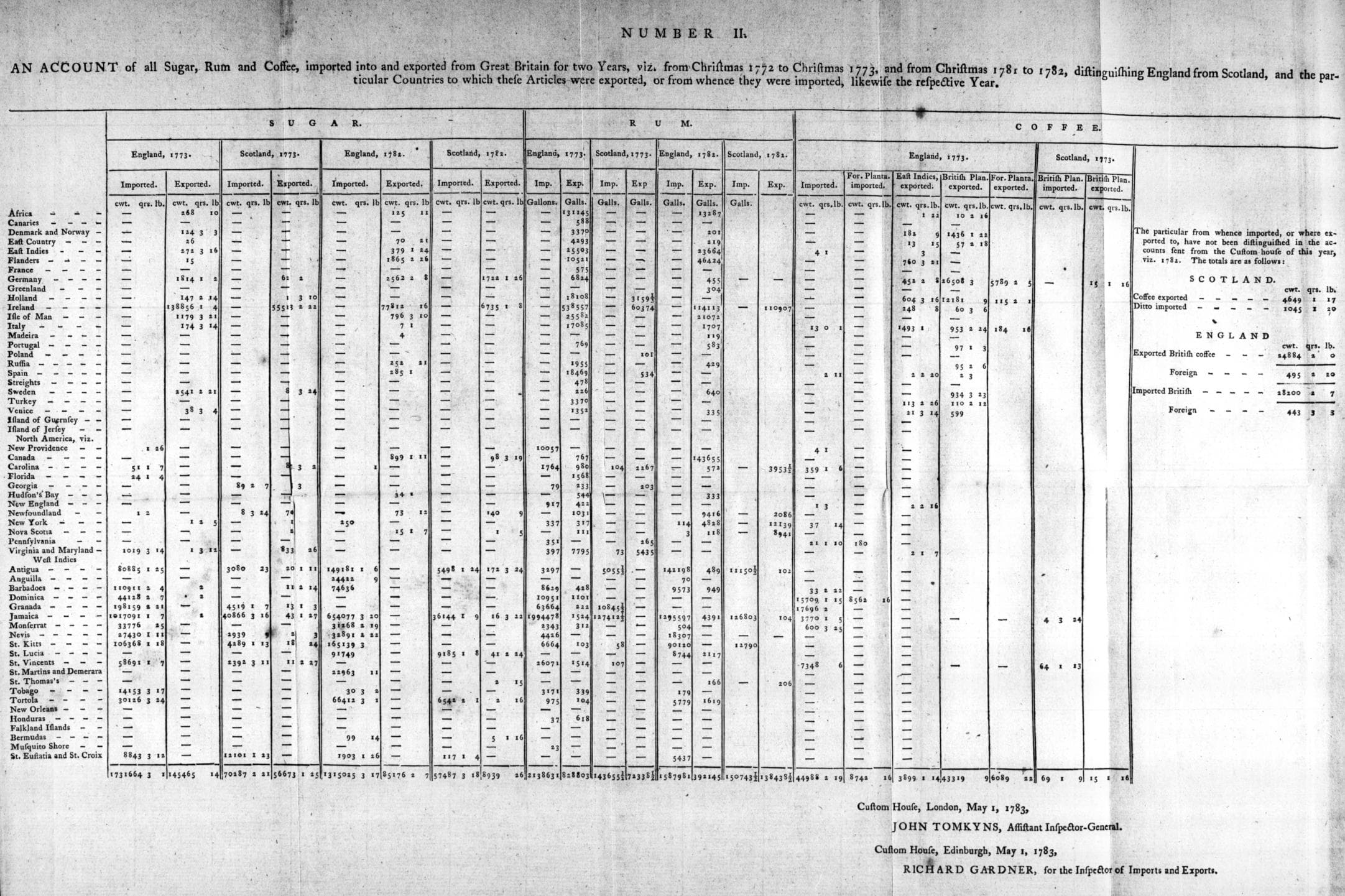 The import statistics for England and Scotland for the years 1773 and 1782 reveal some interesting figures. For example, in 1773, 2,282,286.5 gallons of rum were imported into England and Scotland, of which only 14,079 gallons – that is, 0.6% – did not originate from the West Indies. [6-345 ff.]
