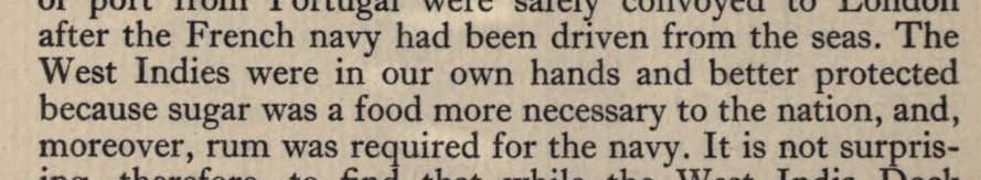 Naturally, rum was mainly imported from British colonies, for as a book on the history of the Port of London, published in 1921, aptly summarises: “The West Indies were in our own hands and better protected because sugar was a food more necessary to the nation, and, moreover, rum was required for the navy.” [4-140]