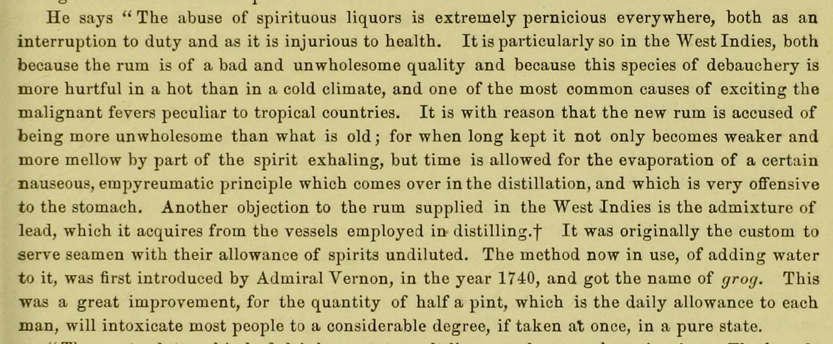 Sir Gilbert Blane of Blanefield, geboren im Jahr 1749 und verstorben 1834, war ein schottischer Arzt, der eine Gesundheitsreform in der Royal Navy einführte. [18] Er empfahl die Verwendung von Spruce Beer, Porter, Ale und Wein anstelle der stärkeren alkoholischen Destillate. [2-41] Er schrieb: »Der Missbrauch von Spirituosen ist überall äußerst schädlich, sowohl als Unterbrechung der Pflicht als auch als Schaden für die Gesundheit. Das gilt besonders für die Westindischen Inseln, weil der Rum von schlechter und ungesunder Qualität ist und weil diese Art der Ausschweifung in einem heißen Klima schädlicher ist als in einem kalten und eine der häufigsten Ursachen für die Erregung der bösartigen Fieber ist, die den tropischen Ländern eigen sind. Zu Recht wird dem neuen Rum vorgeworfen, er sei ungesünder als der alte; denn wenn er lange gelagert wird, wird er nicht nur schwächer und milder durch das Ausatmen eines Teils des Alkohols, sondern es wird auch Zeit für die Verdunstung eines gewissen ekelerregenden, empyreumatischen Prinzips gelassen, das bei der Destillation übergeht und für den Magen sehr unangenehm ist. Ein weiterer Einwand gegen den auf den Westindischen Inseln angebotenen Rum ist die Beimischung von Blei, die er von den bei der Destillation verwendeten Kesseln erhält. Ursprünglich war es üblich, den Seeleuten die ihnen zugeteilte Menge an Spirituosen unverdünnt zu servieren. Die heute gebräuchliche Methode, ihm Wasser beizumischen, wurde erstmals von Admiral Vernon im Jahr 1740 eingeführt und erhielt den Namen Grog. Dies war eine große Verbesserung, denn die Menge von einer halben Pinte, die jedem Mann täglich verabreicht wird, berauscht die meisten Menschen in erheblichem Maße, wenn sie auf einmal und in reinem Zustand eingenommen wird.« [1-323][1-324][17-357]