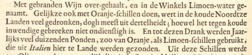 – “Met gebranden Wijn over-gehaalt, en in de Winkels Limoen-water genaamt. Gelijkze ook met Oranje-schillen doen, wert in de koude Noordtze Landen veel gedronken, dogh meest uit dertelheidt; hoewel het tegen koude inwendige gebreeken niet ondienstigh is. En tot dezen Drank werden Jaarlijks veel duizenden Ponden, zoo van Oranje, als Limoen-schillen gebruikt; die uit Italien hier te Lande werden gezonden.” [47-46]